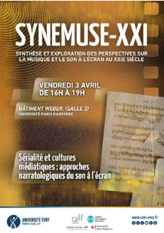 | SYNEMUSE-XXI -Synthèse et Exploration des perspectives sur la musique et le son à l’écran au XXIe siècle 3 avril 2026 Séminaire organisé par Chloé Huvet (RASM-CHCSC) et Aurélie Huz (Université Paris Nanterre), avec le soutien de l'Institut universitaire de France. Séance 3 – « Sérialité et cultures médiatiques : approches narratologiques du son à l'écran ». Séance en partenariat le séminaire LPCM 2025-2026. | |