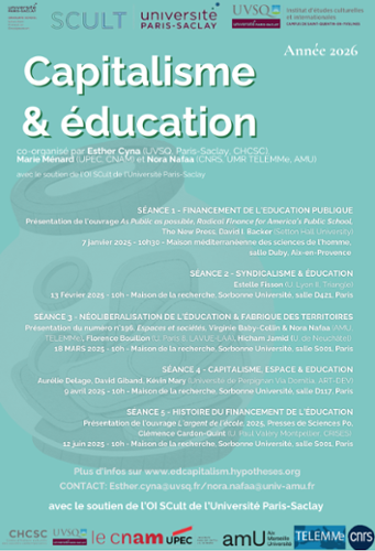 | Capitalisme et éducation - Programme 2026 7 janvier 2026 Séminaire co-organisé par Esther Cyna (UVSQ, Paris-Saclay, CHCSC), Marie Ménard (UPEC, CNAM) et Nora Nafaa (CNRS, UMR TELEMMe, AMU), avec le soutien de l'OI SCult de l'Université Paris-Saclay. | |