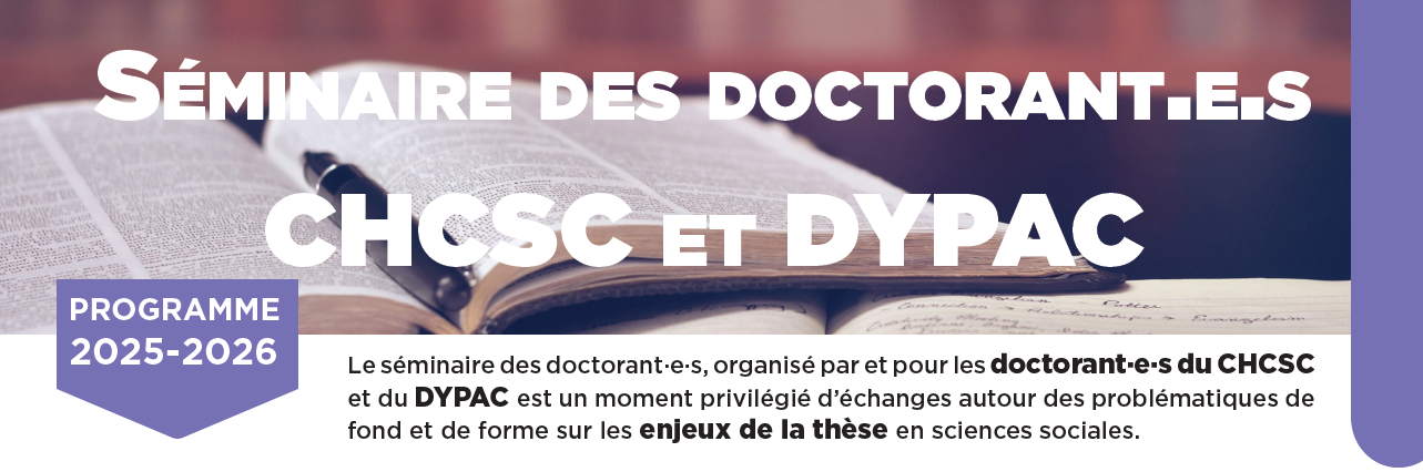 Séminaire des doctorants CHCSC-DYPAC - Programme 2025-2026 23 octobre 2025 Le séminaire des doctorant·e·s, organisé par et pour les doctorant·e·s du CHCSC et du DYPAC est un moment privilégié d’échanges autour des problématiques de fond et de forme sur les enjeux de la thèse en sciences sociales. | |
