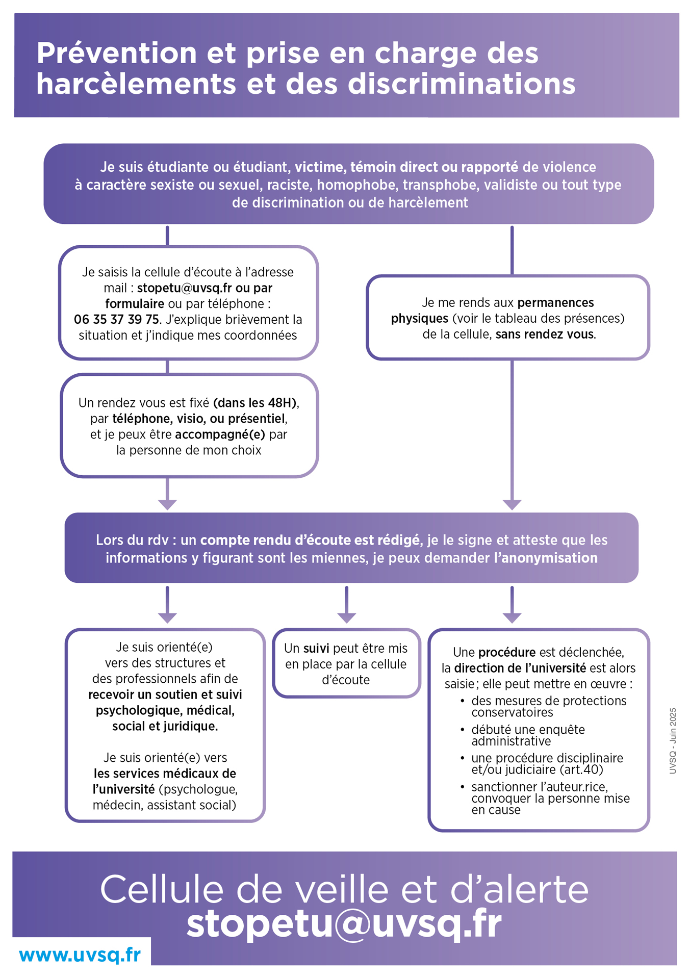 Contactez la cellule de l'UVSQ contre les violences, discriminations, harcèlements et agissements sexistes : stopetu@uvsq.fr.
