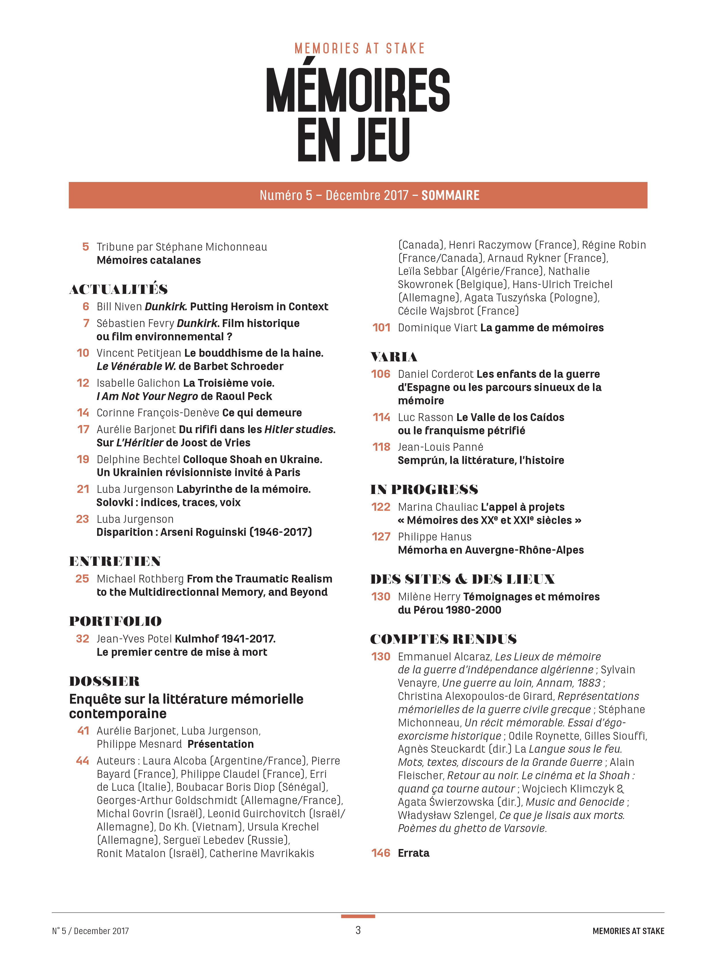 Le numéro 5 contient une enquête consacrée à la littérature mémorielle, pour laquelle la revue a interrogé 21 écrivains de 12 pays différents. On y trouve également un entretien avec Michael Rothberg, un portfolio sur Kulmhof, des articles sur le guerre d’Espagne, sur les films Dunkirk, I Am Not Your Negro, ainsi que des textes d’Aurélie Barjonet, Corinne François-Denève, Jean-Charles Geslot, tous trois membres du CHCSC.
