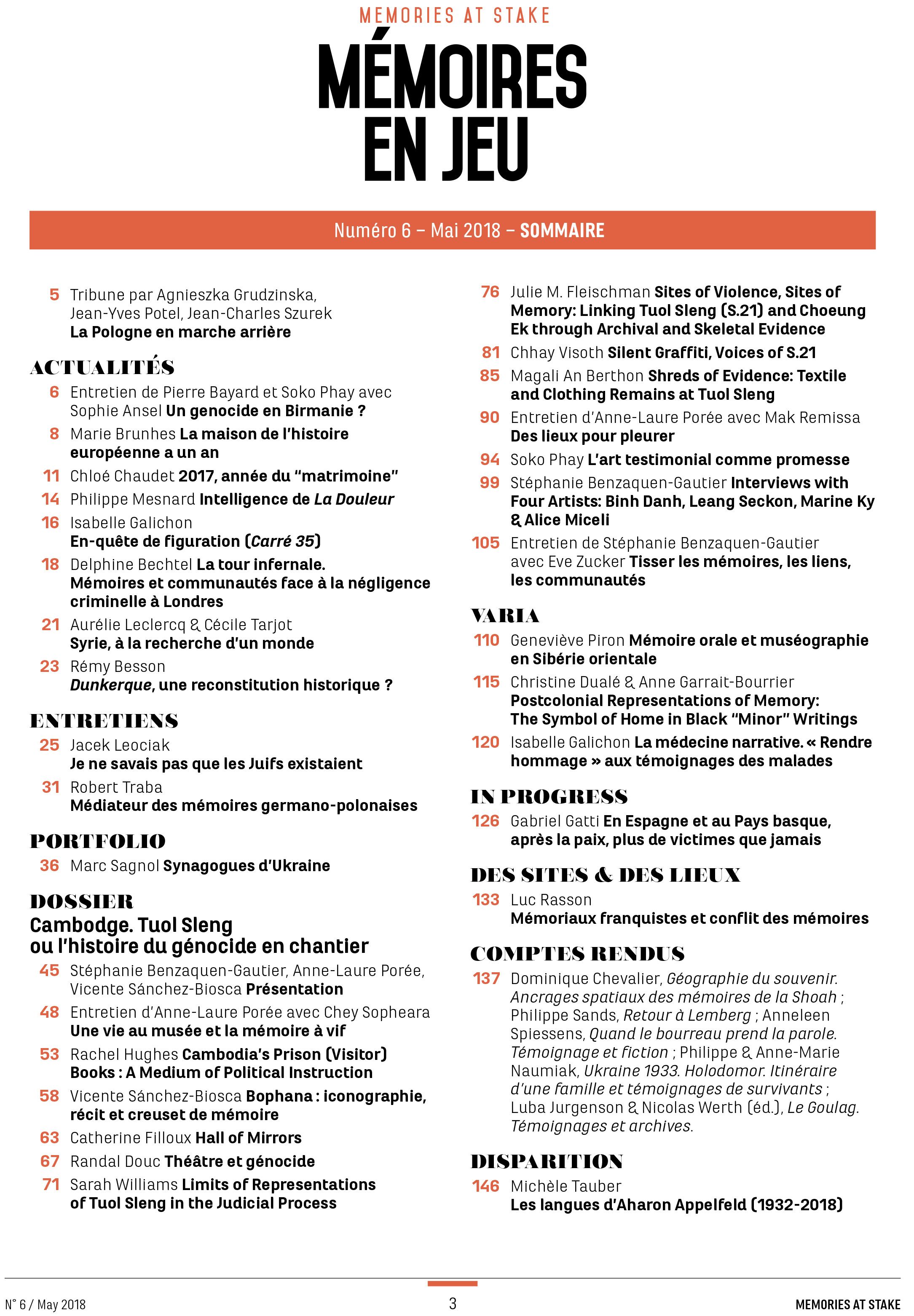 Le numéro 6 contient un dossier intitulé « Cambodge. Tuol Sleng ou l’histoire du génocide en chantier ». On y trouve également des entretiens avec Jacek Leociak et Robert Traba (sur la Pologne), un portfolio sur les synagogues d'Ukraine, des articles sur la mémoire en Sibérie ou encore en Espagne, des actus sur les films La Douleur, Carré 35...