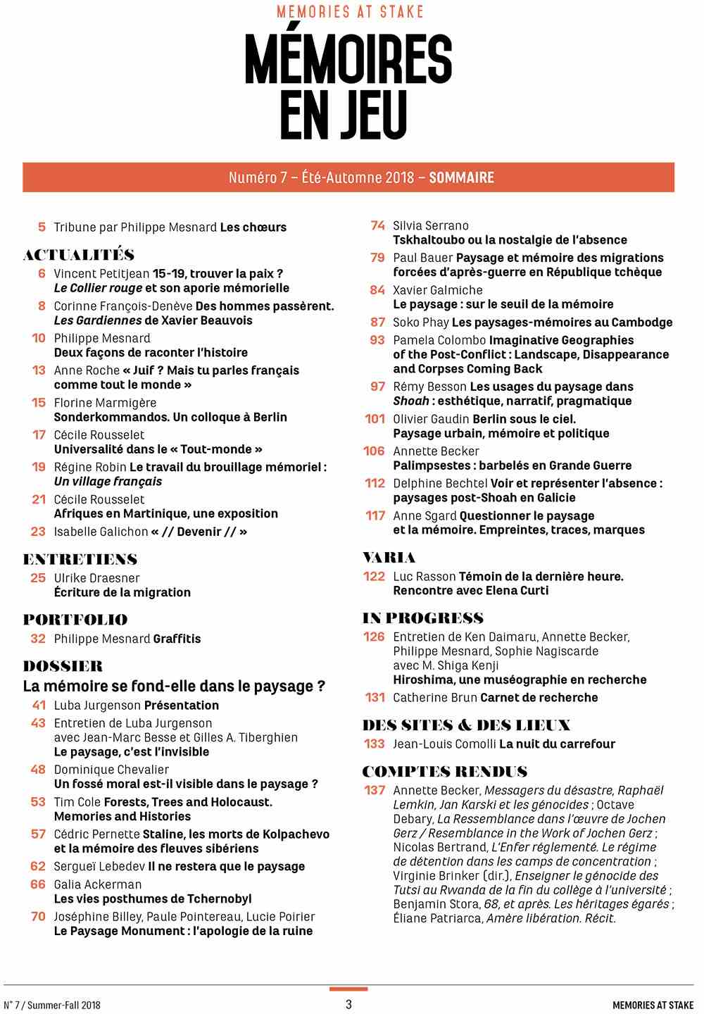 Le numéro 7 contient un dossier intitulé « La mémoire se fond-elle dans le paysage ? ». On y trouve également plusieurs entretiens (avec Elena Curti qui se présente comme la fille de Mussolini, avec l’auteure allemande Ulrike Draesner, ainsi qu’avec le nouveau directeur du musée d’Hiroshima M. Shiga), un portfolio sur les graffitis antisémites, des actus sur les films Le Collier rouge, Les Gardiennes, ou encore Transit et La Révolution silencieuse…