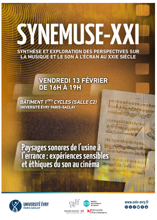 | SYNEMUSE-XXI -Synthèse et Exploration des perspectives sur la musique et le son à l’écran au XXIe siècle 13 février 2026 Séminaire organisé par Chloé Huvet (RASM-CHCSC) et Aurélie Huz (Université Paris Nanterre), avec le soutien de l'Institut universitaire de France. Séance 2 – « Paysages sonores de l'usine à l’errance : expériences sensibles et éthiques du son au cinéma » | |